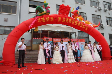 鞭炮齐鸣锣鼓闹,金狮起舞祥云绕。9月20日,青岛金沙9001以诚为本“爱随帆动”集体婚礼隆重举行。在这个收获的季节里,五名年轻员工也收获了各自的爱情,与爱侣喜结连理。公司领导及全体员工共同为他们的爱情作了见证。