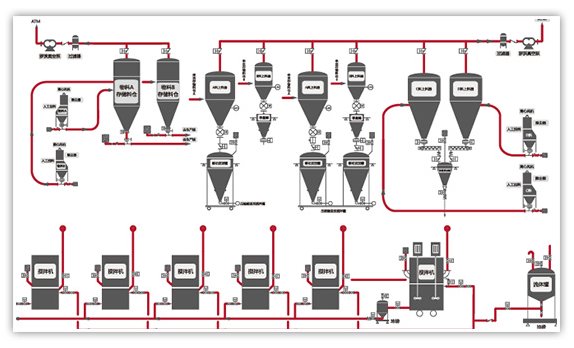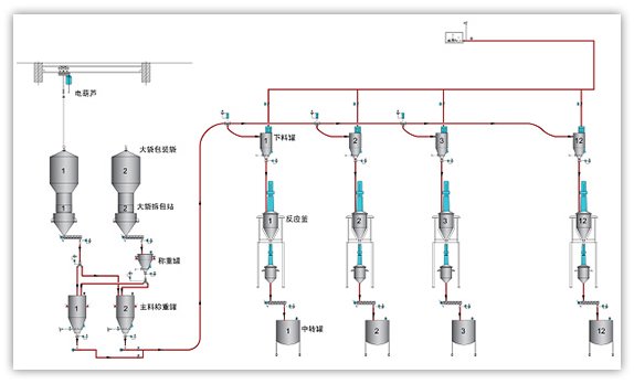 原料输送:可实现大批量、远距离、高效率输送;快速准确的取料并输送到指定位置;管道封闭输送有效避免污染。